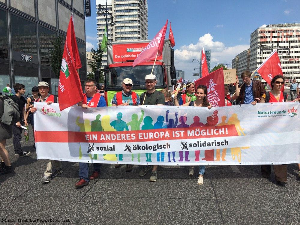 Die NaturFreunde stellten Redner*innen auf allen Bühnen, organisierten in allen Städten Demo-Blöcke mit der Botschaft „Ein anderes Europa ist möglich – sozial, ökologisch, solidarisch“ und beherbergten in der Berliner Landesgeschäftsstelle auch das Bündnisbüro. Bundesvorstandsmitglied Uwe Hiksch hatte zudem alle sieben Demonstrationen angemeldet und war selbst Versammlungsleiter der Berliner Demonstration, wo auch ein NaturFreunde-Lastwagen als Auftaktbühne (Ökologie/Klima) fungierte und im Demozug mitfuhr.