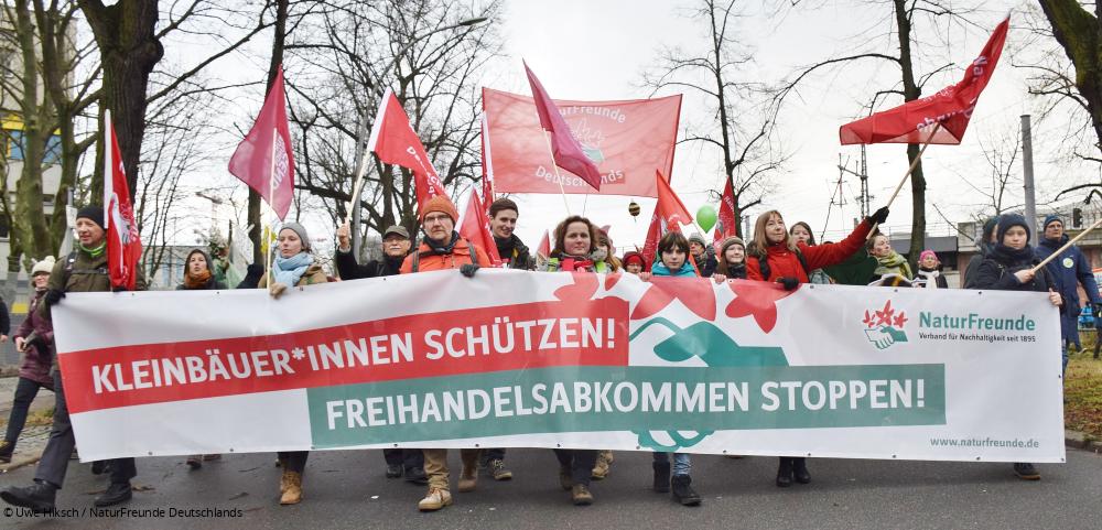 Mit den neoliberalen Freihandelsabkommen soll diese wirtschaftliche Übermacht der hegemonialen Staaten der EU gefestigt werden. Abkommen wie TTIP, CETA oder JEFTA haben die Aufgaben, wirtschaftliche Vorteile der ökonomisch starken Staaten zu zementieren und Wettbewerbsvorteile gegenüber anderen Regionen auszubauen. Dem Ziel einer nachhaltigen und gerechten Weltwirtschaft werden solche Abkommen nicht gerecht. Deshalb arbeiten die NaturFreunde seit vielen Jahren in Bündnissen mit, die sich gegen diese neoliberalen Freihandelsabkommen einsetzen. Gemeinsam mit Gewerkschaften, anderen Umweltverbänden, globalisierungskritischen Bewegungen und vielen Aktivist*innen engagieren sich die NaturFreunde für ein Ende der heutigen neoliberalen Freihandelspolitik und für eine grundsätzliche Neuausrichtung der Außenhandelspolitik der EU.