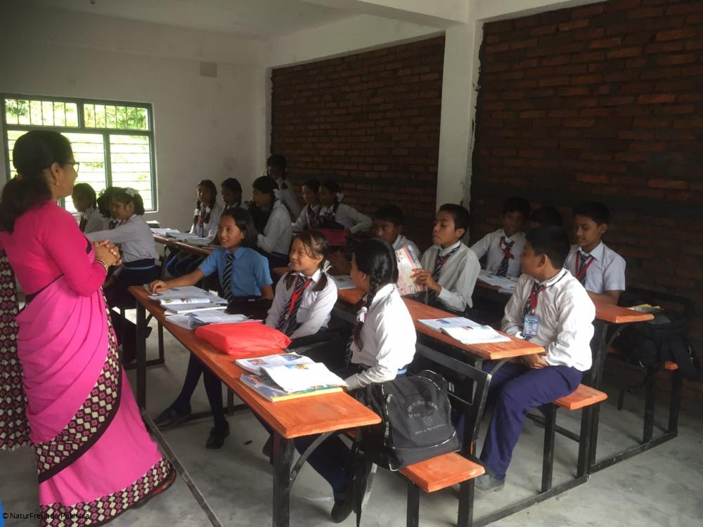 Seit den Erdbeben warb der nepalesische NaturFreund Nabaraj Adhikari um weitere Spenden für den Wiederaufbau der Ambika Secondary School. Denn die nepalesische Regierung ist mit der Beseitigung der landesweiten Schäden schlicht überfordert. Europäische Spender_ innen finanzierten so auch die Fertigstellung des Rohbaus, es fehlte nur noch die Einrichtung von vier Klassenzimmern.
